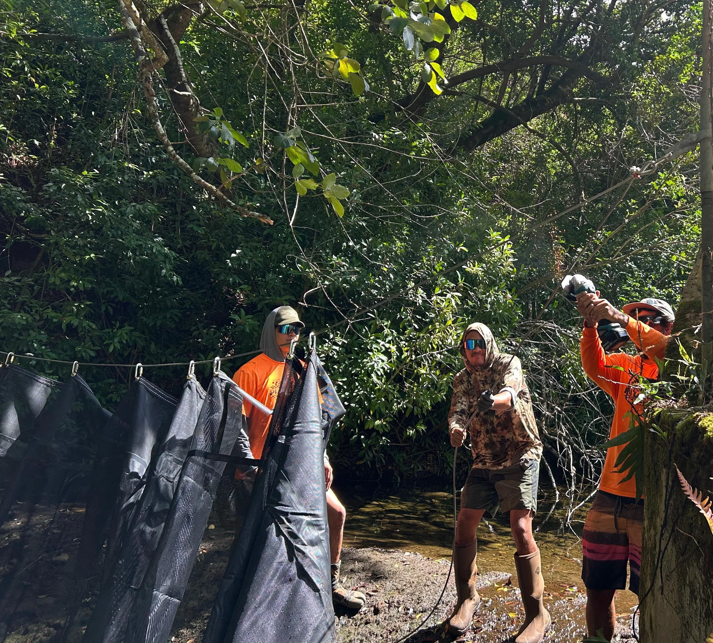 A “stream curtain” is a large tarp that we place across streams. Water flows out but pigs can’t get in. We replaced two this fall but it isn’t easy - we have to fly the materials in by helicopter and hike down deep into the gulches to install them.